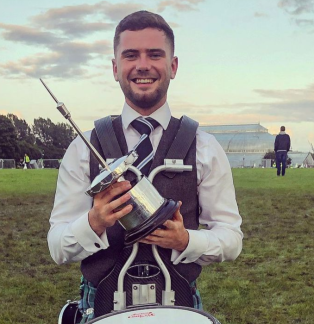 Er spielte 6 Jahre mit der National Youth Pipe Band, davon 3 Jahre lang als leading drummer.